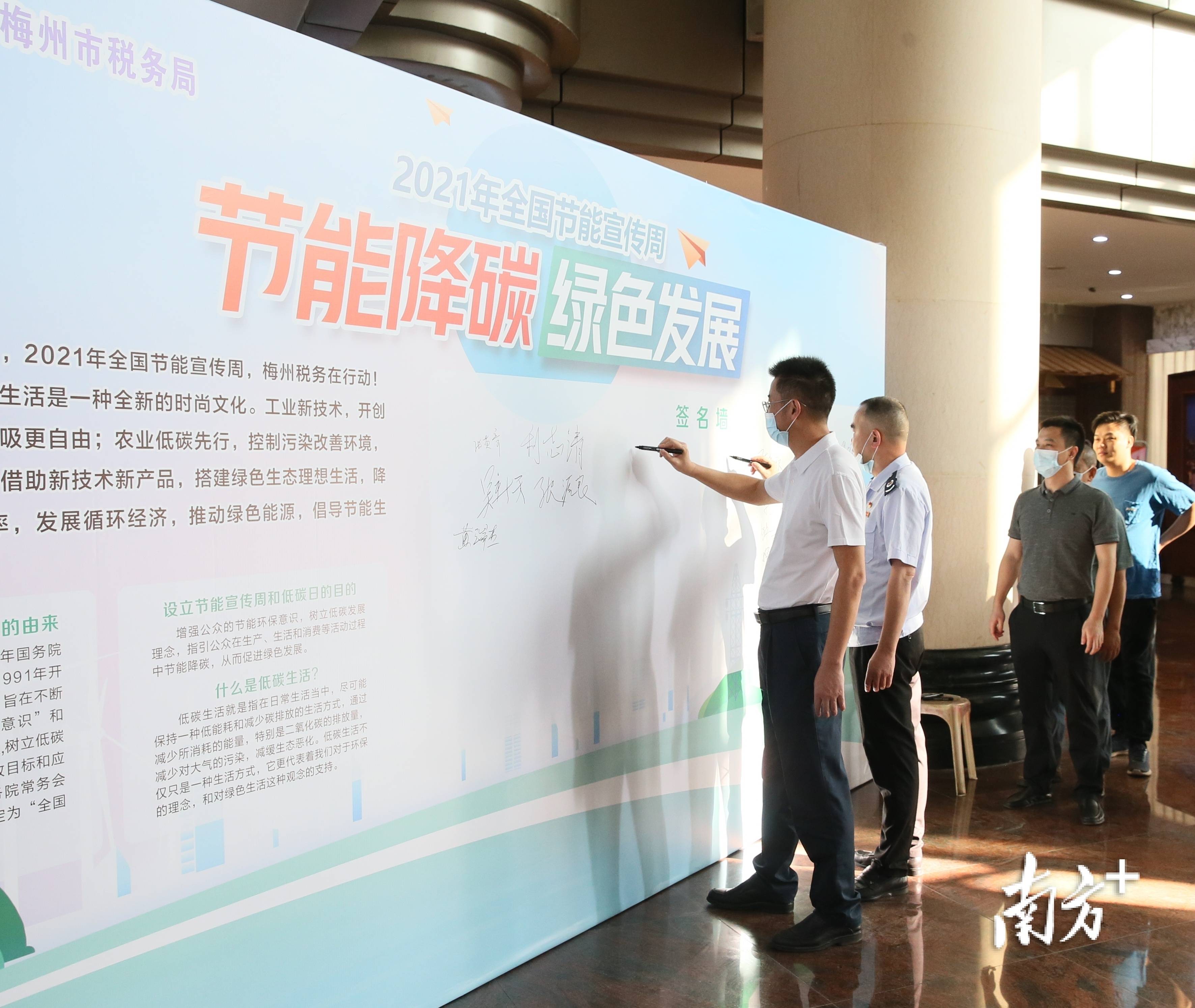 “通过参加活动,丰富了绿色低碳相关知识,提升了节能减排意识,我将在日常工作、生活中做到事事节能,成为低碳生活的倡导者、践行者和传播者。”在节能低碳行动倡议背景墙上签下自己的名字后,国家税务总局梅州市税务局机关服务中心黄瑞杰说。