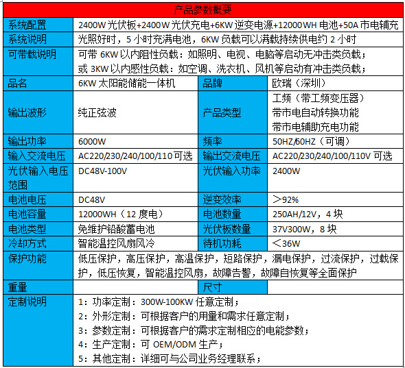 深圳欧瑞电力生产的太阳能储能发电系统,结合目前储能型逆变电源的优点和缺点进行升级优化、全面改进,并且采用全新的工频逆变电路方案而设计,具备高转换效率、高稳定性、超低损耗、超强带载能力、超强抗干扰能力的特性;可为商业、工业、民用、军用、电信设备等提供可靠的正弦波交流电源。主要用于空调、电视、收银机、冰箱、洗衣机、电脑、电动工具、照明、工业设备、电信设备等各类负载。