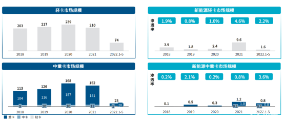 商用车市场经历了持续增长后,随着国六切换完成迎来周期性下滑。此外, 2022年的疫情发酵更是使得行业陷入谷底。