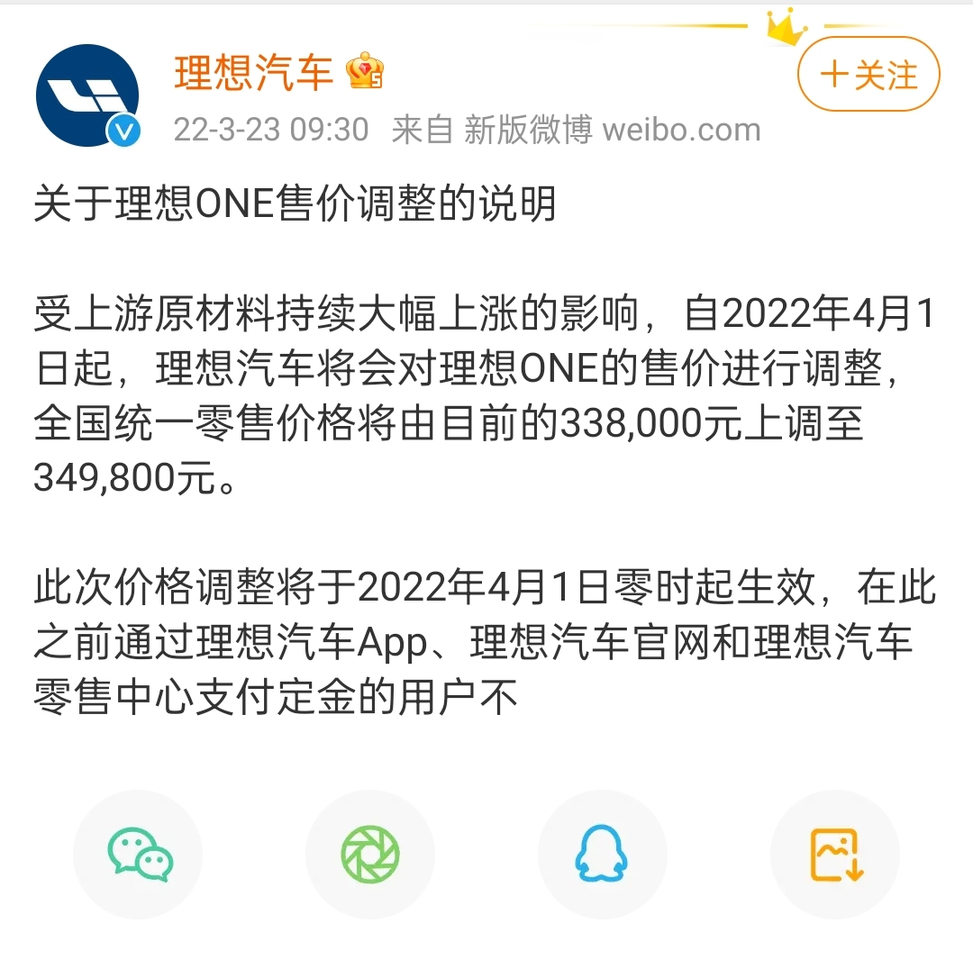 不打算涨价的理想也涨价了。3月23日上午,理想汽车宣布,4月1日起,理想ONE价格上调11800元,涨幅3.4%。